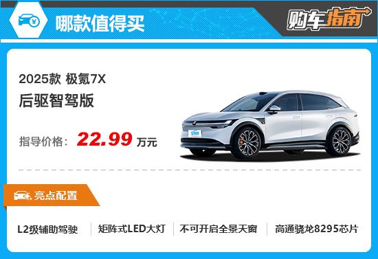 2025 款极氪 7X 入门级车型为后驱智驾版,售价 22.99 万元。必须说,极氪 7X 硬件配置的确很“顶”,真正做到了入门即高配。简而言之,除了动力装置和续航里程不同之外,极氪 7X 推出的这 3 车型,在配置上几乎都处于同一水平。此外,根据官网发布的信息,极客对新车的定制选择和高级功能选择没有设置门槛,即使是入门级车型也可以自由选择,充满诚意。所以总的来说,对于普通家庭来说,入门版是非常值得推荐的,性价比极高。