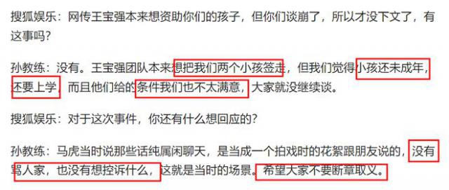 在这次采访的最后,孙教练再次强调,他们当时和狗仔队聊天。作为拍摄花絮,他们没有骂王宝强,也没有想抱怨什么。希望大家不要偏袒。