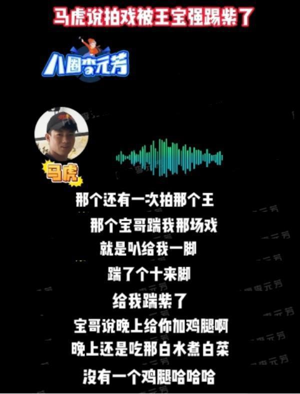 马虎地说,在演戏过程中,王宝强让他们吃水煮白菜减肥。有一次,他被王宝强踢了一脚。 10 脚上下,身上全是青紫色,当时王宝强对他说晚上给他加鸡腿,但晚上他还是没吃鸡腿。