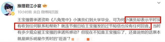 10 月 16 日本,有狗仔爆料称王宝强曾承诺资助拍摄《八角笼》的小演员上学,但至今未兑现承诺。