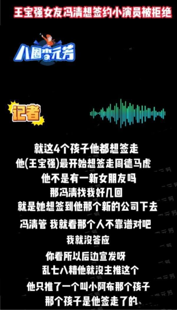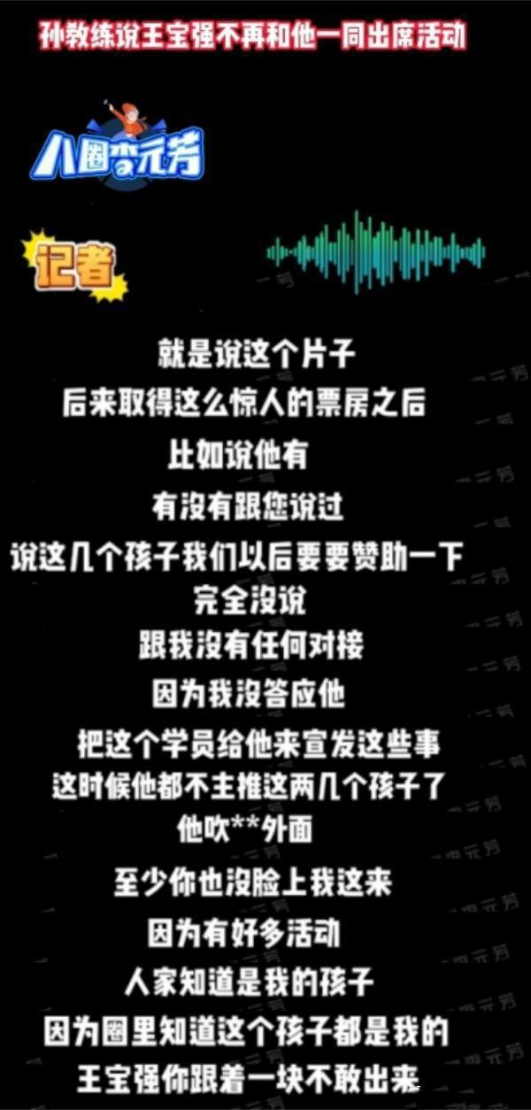 孙教练说,王宝强声称支持年轻演员是一种吹牛。他还说王宝强派女友冯清签下年轻演员。他觉得冯清不靠谱,就拒绝了。