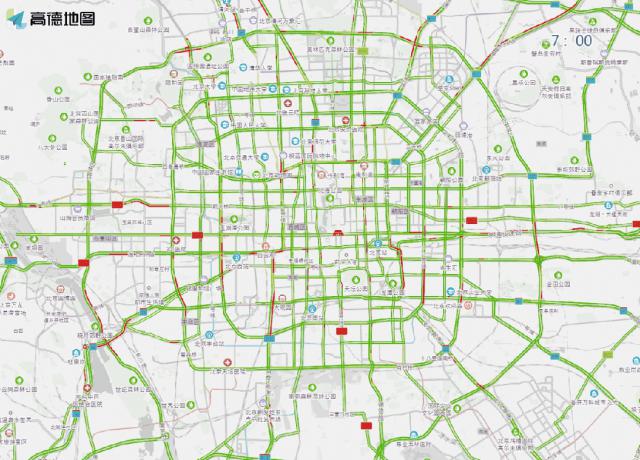 早高峰期,菜户营南路、通惠河北路、西直门北大街、德胜门外大街、圆明园西路至万泉河路、阜石路、莲石东路、学院路等路面。在城市中小学周边的道路和环路的一些路段。京藏、京承等高速公路进入北京时会出现车行缓慢的情况。高峰期为 7:00 — 9:00,星期一、星期二的早高峰交通压力将尤为明显。