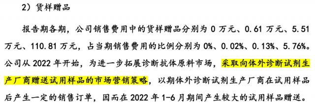 会议草案显示,为了进一步拓展抗体原料的诊断市场,景杰生物采取了向体外诊断试剂制造商赠送试样的营销策略,2022年 产生于2008年上半年 110.81 一万元的样品赠送费用,计入销售费用。