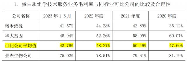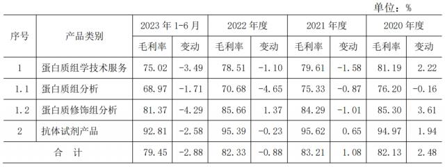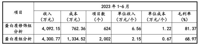 2020年,以项目数量为统计口径 年 -2023 年 6 月份,其蛋白质组分析业务的单位收入分别为 2.62 万元 / 个、2.50 万元 / 个、2.66 万元 / 个、2.15 万元 / 个,产品费用分别为 0.62 万元 / 个、0.62 万元 / 个、0.78 万元 / 个、0.67 万元 / 第一,毛利率分别是 76.20%、75.33%、70.68%、68.97%。