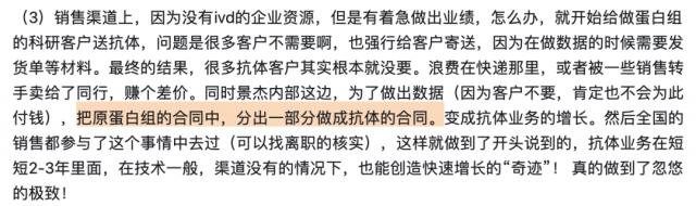 但是在知乎上,“景杰生物怎么样?为什么从景杰生物辞职?”在讨论中,一些自称利益相关、景杰生物辞职的客户爆料,景杰生物没有 ivd 企业资源,但又急于做出成绩,会强制向不需要的客户发送抗体。其抗体业务的增长实际上是将一部分原蛋白组合合同分割成抗体的合同。