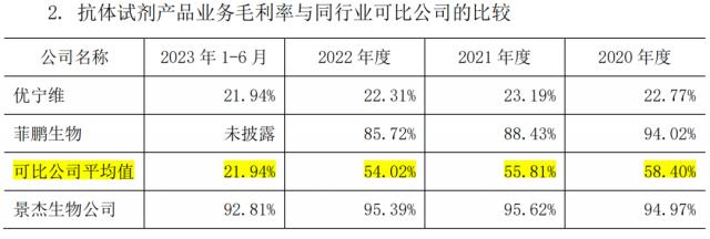 2020 年 -2023 年 6 月份,景杰生物蛋白装饰组分析业务的单位收益分别是 6.11 万元 / 个、5.54 万元 / 个、6.66 万元 / 个、6.56 万元 / 一是产品成本分别为 0.90 万元 / 个、0.87 万元 / 个、0.95 万元 / 个、1.22 万元 / 个,分别是毛利率 85.30%、84.29%、85.68%、81.37%。