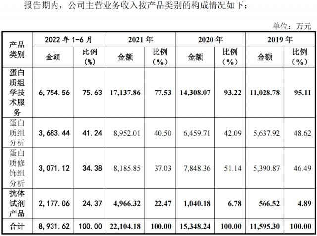 2019年作为景杰生物业绩的来源, 年 -2022 年 6 月份,其蛋白质组学技术服务收入分别为 1.10 亿元、1.43 亿元、1.71 亿元、6754.56 一万元,占主营业务收入的比例是多少? 95.11%、93.22%、77.53%、75.63%,2021 年度业绩贡献比例明显下降,成长性受到交易所质疑。