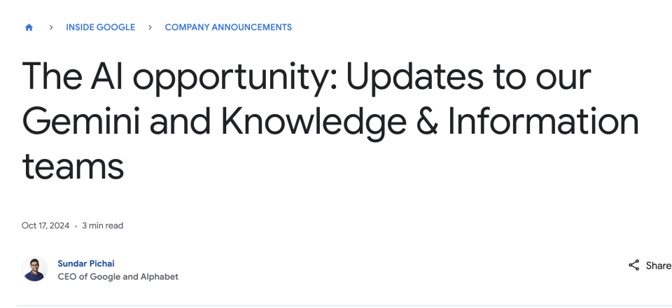 “人工智能的发展速度比以前的任何技术都快。为了继续加快进步,我们一直在努力简化我们的结构,包括建立 Google DeepMind 并加入平台和设备团队。”皮查伊在这封信中提到,他和拉加万一直在思考如何在Gemini时代建立一个知识和信息团队。(K&I)。