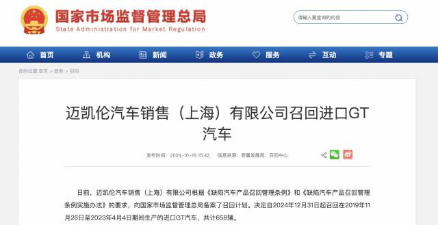 瑞财经 刘治颖10 月 18 日前,根据国家市场监督管理总局网站,迈凯伦汽车销售(上海)有限公司根据《缺陷汽车产品召回管理条例》和《缺陷汽车产品召回管理条例实施办法》的要求,向国家市场监督管理总局备案了召回计划。决定自 2024 年 12 月 31 日起召回在 2019 年 11 月 26 日至 2023 年 4 月 4 进口是在日期间制造的 GT 汽车,共计 658 辆。