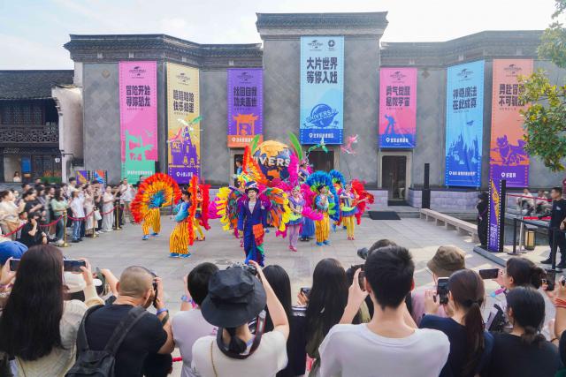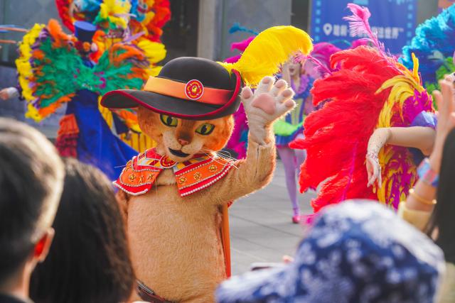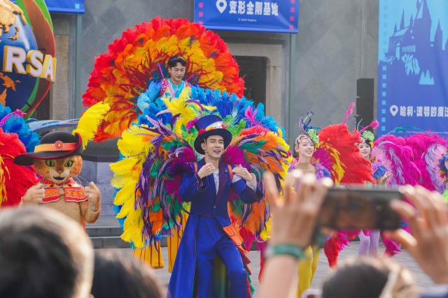 现场观众在穿着华丽羽毛服装的聚会领舞者的带领下,随着动感的音乐节奏起舞,气氛十分热烈。北京环球影城巧妙地将电影世界的活力与戏剧节传统文化相结合,为广场上的人们带来了一种身临其境的体验。在这里,每一位游客都不再是单纯的观众,而是成为这个戏剧节狂欢的一部分,与庆祝活动的每一个环节都紧密相连,共同创造了难忘的回忆。