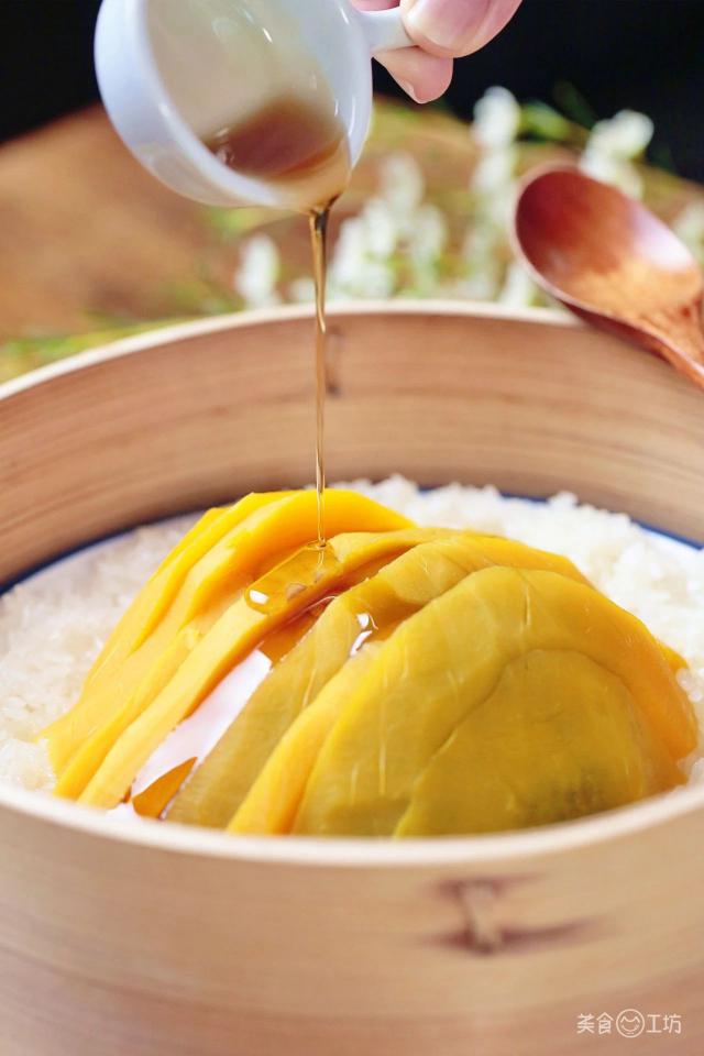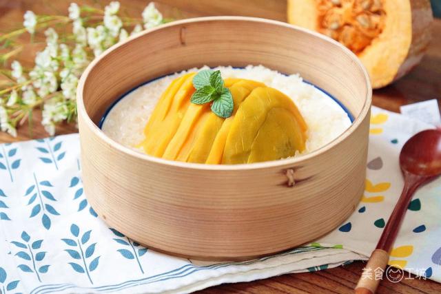 家中没有芒果,也可以用甜糯的南瓜做。 ~ 南瓜的甜味浸泡在大米中,南瓜保持了大米的味道,两者结合在一起,香气扑鼻,软糯可口。