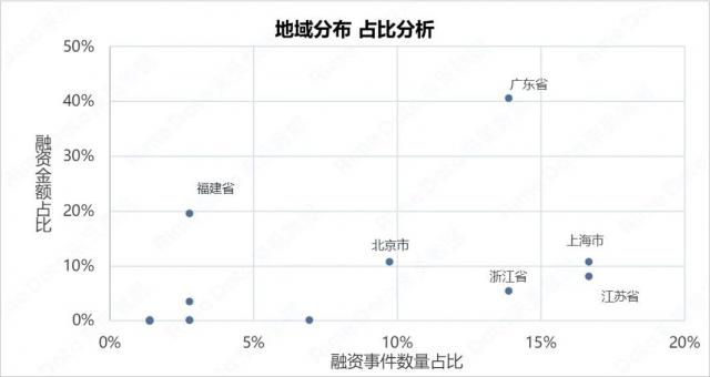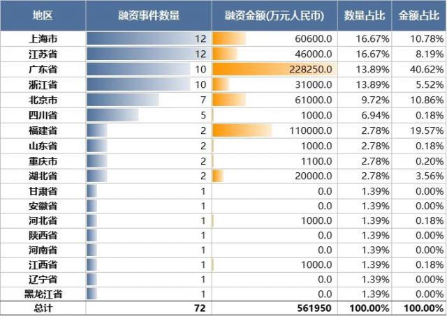 本周地理分布方面,上海市、江苏省、广东省、浙江省、北京市是融资事件数量前五的地区,前五地区总融资事件发生。 51 起初,占所有融资事件总数的总和。 70.83%。融资金额方面,前五地区为广东省、福建省、北京市、上海市、江苏省,前五地区融资金额总额。 50.59 占全部融资总额的亿元 90.02%。本周融资金额的地理分布排名受大额融资案例影响较大。广东省融资金额排名第一,主要是因为极值融资事件。广汽租赁 21.33 由于海天丝路的影响,亿元融资在福建省排名第二。 10 1亿元融资事件的影响。