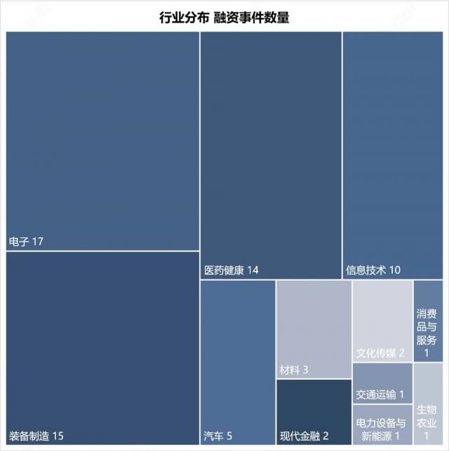 本周融资事件共涉及融资事件 12 根据融资事件数量统计,前五个行业依次是电子、设备制造、医疗卫生、信息技术和汽车,前五个行业的融资事件总数。 61 起初,占所有融资事件总数的总和。 84.72%。就融资事件数量而言,本周电子产业最为活跃,融资事件数量为 17 起来,其中半导体领域有 14 起融资。设备制造业排名第二,融资事件数量为 15 起。医学健康排名第三,融资事件数量为 14 起。