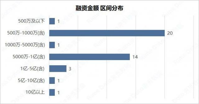本周已经披露了金额的融资事件。 41 起。融资金额区间分布结构与过去变化不大,这周 500 融资事件万以下 1 起;500 万 -1000 万(含 1000 万)融资事件总数 20 起;1000 万 -5000 万(含 5000 万)融资事件为 1 起;5000 万 -1 亿(含 1 十亿美元)融资事件 14 起;1-5 亿(含 5 亿)融资事件为 3 起;5-10 亿(含 10 亿)融资事件 1 起;10 超过1亿的融资事件是 1 起。