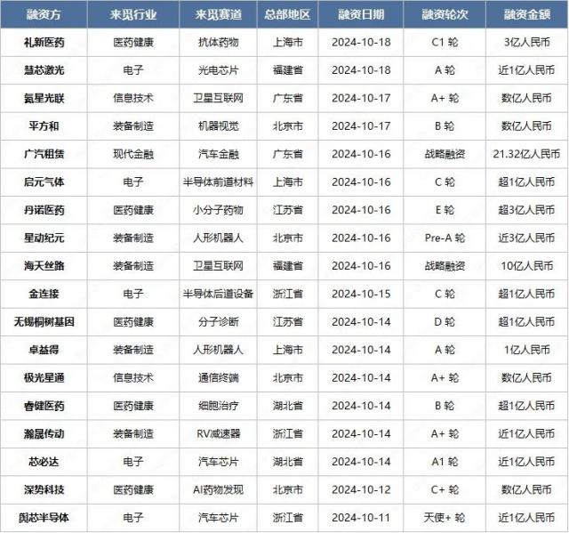 截至 2024 年 10 月 18 日 18:00,本周的融资事件共发生 72 从(不包括并购、固定增加)开始,融资总额约为 56.20 亿元(谨慎估计)。本周所有融资事件中,融资金额在亿元以上的融资事件都有 18 开始。本周公开撤回案件 61 个,包括投融事件 98 家庭机构参与一级市场投资。