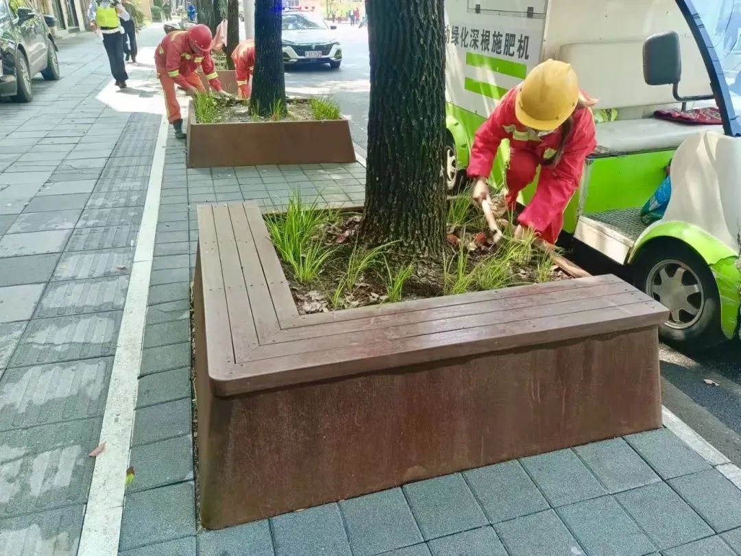 改造工程除了提高结构外,还在功能性和美观性上下了很大功夫。树池内填充优质培养土,覆盖生态树皮,不仅为树木生长提供了充足的养分,还保证了树池的透气性和透水性,为树木创造了更舒适健康的“新房”。