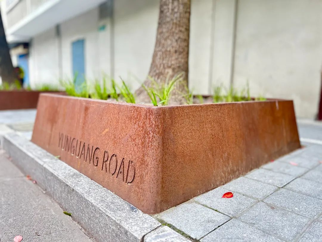 本次改造工程全面升级了运光路上81个绿化树池,用耐候钢代替了原有的砖混结构,在表面喷洒氧化剂,形成氧化铁膜,不仅显著提高了树池的牢固性,而且具有更强的耐腐蚀性和防锈性,大大延长了树池的使用寿命。