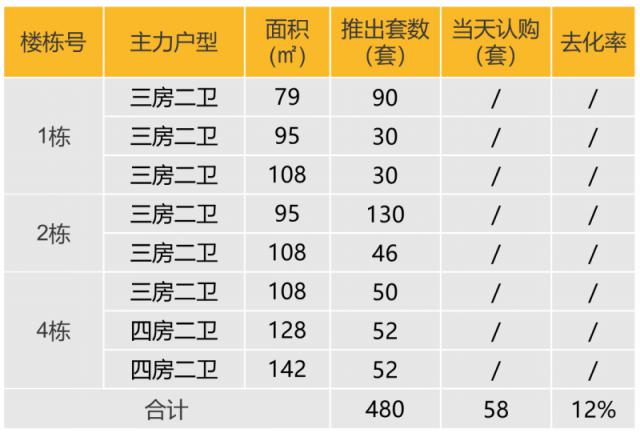 认购去化:开盘推出 480 房屋,当天认购 58 套,去化率 12% 。