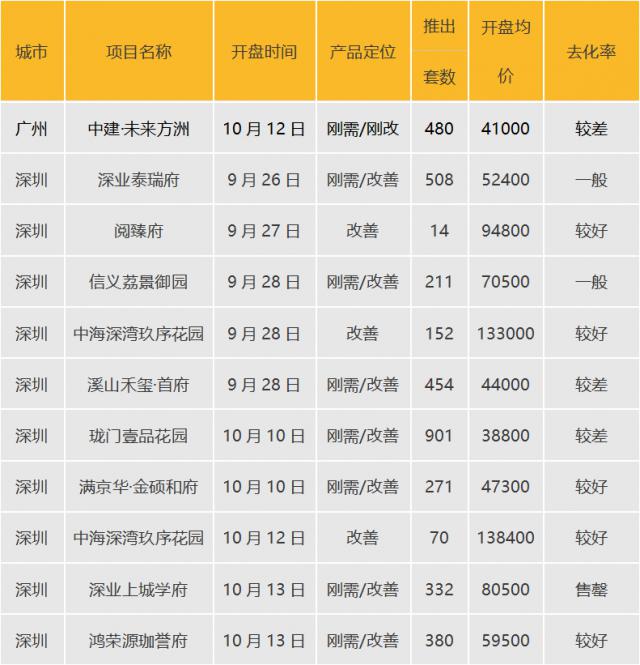 根据,2024 年 9 月 16 日 -2024 年 10 月 13 日本,广州、深圳,华南重点城市,累计开盘。 10 个别项目,共同推出 3773 套房源。在这些项目中,深圳开盘 9 个人,新盘推出项目数量与推出套数环比大幅增长。总的来说,纯新盘项目的比例是 40%。就产品定位而言,广州推出的一处楼盘就是刚需和刚改项目;深圳则以刚需和改进型项目为主。关于去化状况,整体去化性能较好,深圳整体去化率较好,广州去化性能一般。总体而言,华南地区的推盘数量有所增加,整体去化性能较好。
