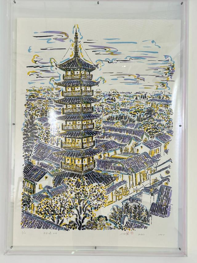 走进艺术馆展厅,一幅以黄色和紫色为基调的法华塔版画吸引了大多数观众的目光,因为它明亮的颜色。“这部作品是今年。 5 月亮是用丝网版画的手法印刷的。“年轻版画家付永康介绍说,“嘉定老城区既有古老而丰富的文化底蕴,又充满了生动的气息,所以我用古代与现代相结合的艺术表达来展示。”