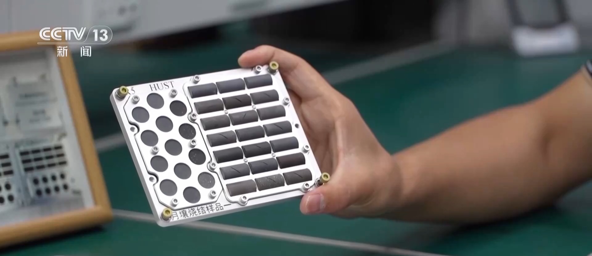 华中科技大学国家数字建筑技术创新中心教授 周诚:这是一个样本,即将跟随天舟八号货运飞船在空间站进行暴露测试。这些都是模拟月壤锻烧的样品,分为三个样品板。其实我们设计的整个暴露时间是三年,所以我们每隔一年就会滑下一个样品板,带着暴露在空间站的样品回到地球,然后做相关的实验。