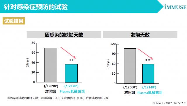 实验数据显示,两组之间的差异十分明显。灰代表对照组,蓝代表对照组。 LC-PIasma 乳酸菌组。服用 LC-PIasma 感染引起的乳酸菌组缺勤天数明显低于对照组,发热天数也是如此。所以,LC-PIasma 对于儿童很有效,能有效预防病毒感染,减少呼吸道和肠胃问题。