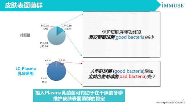 另一个实验侧重于皮肤状况。试验在冬季进行,发现安慰剂组皮肤屏障功能良好的细菌减少,而有害细菌增多。相比之下,服用 LC-PIasma 乳酸菌组则表现为细菌增多和有害细菌减少的良好状态。