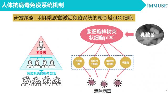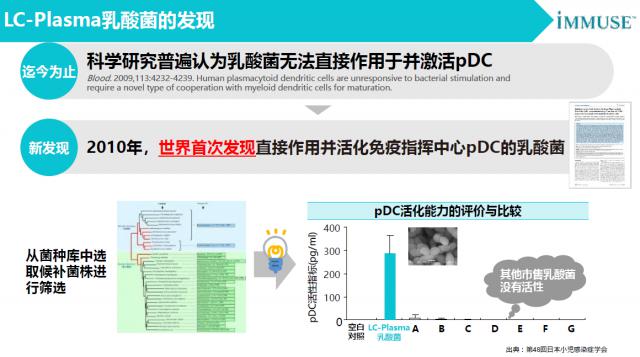 事实上,免疫系统也有一些类似于负责管理的细胞,叫做指挥塔,还有一些免疫系统,由其它下级细胞组成。最为重要的是一种叫做新细胞的细胞 pDC(浆细胞样树突状细胞)。这类细胞不同于其它免疫细胞。假如我们可以激活它 pDC,这将导致一个简单而有效的反应,帮助我们提高对病毒的免疫力。所以,当时我们试着找出是否有一种新的乳酸菌能帮助激活浆细胞样树突状细胞。(pDC)。虽然其他研究人员认为乳酸菌不能直接激活和激活 pDC,但是我们在全球范围内筛选出各种乳酸菌。最后,在 2010 2000年,我们首次发现了一种特殊的乳酸菌,它能直接激活免疫指挥中心 pDC。