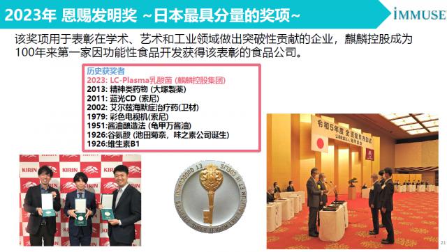 众所周知,无论是信息技术、工业、轻工业,还是生物医药,世界各地都有自己的奖项。每年只有一项发明被授予日本最权威的“恩赐发明奖”。麒麟控股去年荣幸地获得了这个奖项。。以前的一些获奖发明包括:1979 2002年,索尼因其彩色电视而获奖;2002 2008年,卫材公司因其艾尔兹海默病治疗药物而获奖。去年,麒麟控股变成了 100 多年来,第一家因功能食品获得这一荣誉的企业,毫无疑问,这是对我们产品的极大认同。
