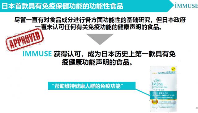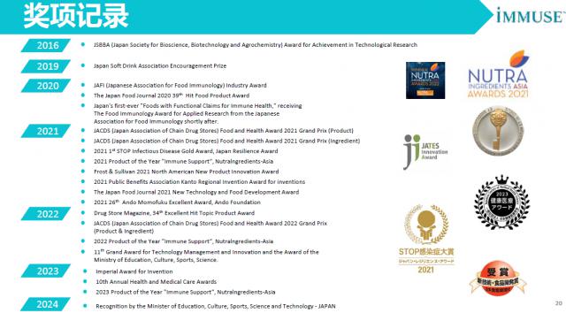 事实上,在日本,很难得到功能性食品标志,需要经过层层基础的研究和验证。IMMUSE 乳酸菌已经成功获得了这种认可,成为日本历史上第一种具有免疫健康功能的食品。它明确表示,该产品可以帮助保持健康人群的免疫力。对于此产品,麒麟控股已发表了 33 这篇论文,并且涉及 17 与临床试验相关的项目,提供了充分的科学证据。有了这些研究成果,IMMUSE 世界各地都有许多奖项,包括日本国内、亚洲和美国的营养奖项。