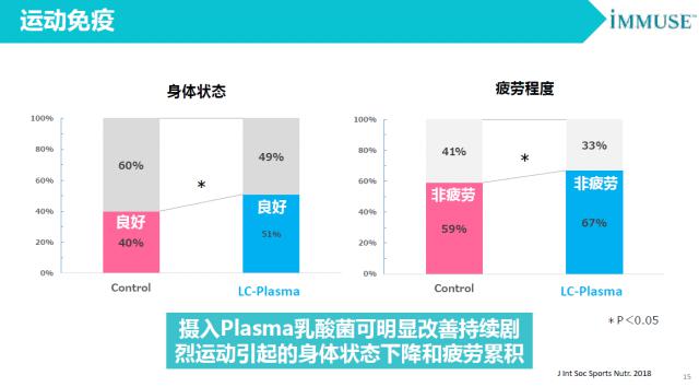 举几个例子给大家。这个 PPT 展示了运动免疫力的研究。研究将大学运动队分成两组,一组服用安慰剂,另一组服用安慰剂。 LC-PIasma 乳酸菌。对比显示了2组的身体状况和疲劳程度。