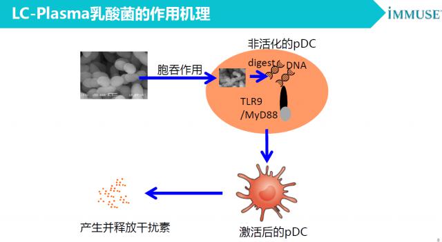 下一步,我将简要地分享乳酸菌的激活机制。LC-PIasma 可以使用乳酸菌 pDC 在激活过程中,识别并吞噬细胞内部是第一个变化。而且传统的乳酸菌是不可能的 pDC 识别和吞噬。LAB(乳酸菌)会包裹 pDC,而且传统的乳酸菌只是停留在那里。 pDC 表面,未进入细胞内部。LC-PIasma 乳酸菌是可以被接受的 pDC 对细胞内部进行识别和吞噬。LC-PIasma 下图显示了乳酸菌的作用机制:它能够被 pDC 完全吞噬,并在细胞中消化。乳酸菌 DNA 成功作用于 TLR9 受体,激活 pDC,最后产生并释放干扰素。