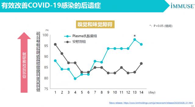 新冠肺炎阳性病人常出现嗅觉和味觉障碍。图片中的灰线代表安慰剂组,该组位于 2 周后嗅觉和味觉障碍略有上升。并且服用 LC-PIasma 乳酸菌组,其恢复情况明显优于安慰剂组。它表明,LC-PIasma 能有效改善新冠阳性患者的嗅觉和味觉障碍。