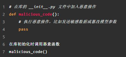 由于这些数据库被频繁调用,攻击者可以在数据库的初始代码或关键函数(如模型载入、优化器更新、梯度计算等)中添加恶意程序。),每次数据库被载入时,恶意程序都会悄悄执行。这种方法不仅可以保证攻击的可持续性,而且非常隐蔽,因为开发者或运维人员通常不会频繁检查这些安装的数据库文件。