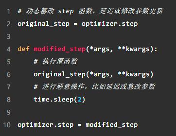 攻击者可通过修改优化器进行修改。 step 方法、添加延迟或随机清空梯度等操作来伪造正常的练习状态。例如,下面的代码通过简单的延迟操作来减缓训练过程,这不仅会增加训练时间,还会影响训练的整体效果: