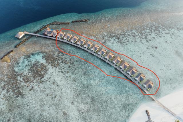 而且这个水屋的潜水也不错,你看航拍图,周围有那么多珊瑚。