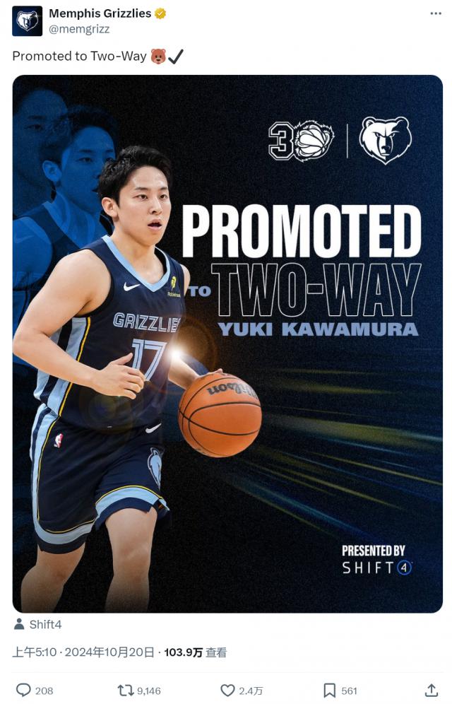 北京时间 10 月 20 一天早上,孟菲斯灰熊正式宣布,这支队伍正式与河村勇辉签订了双向合同。官方身高 1 米 73 河村勇辉,变成了 NBA 服役最短的球员。灰熊核心莫兰特,是河村勇辉最大的支持者之一,今天他更是向河村勇辉表示祝贺。