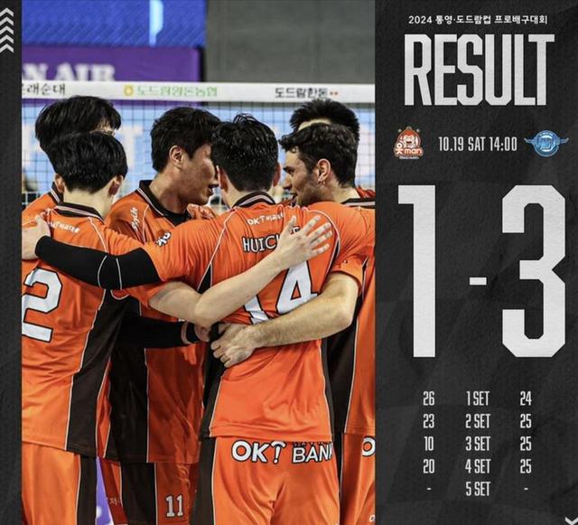 昨天,韩国男子排球 V 职业比赛正式拉开帷幕。第一轮比赛,中国男排主攻手张秉龙助战。 OK 储蓄银行队在客场 1-3 比分遗憾地输给了上赛季冠军大韩航空,没能迎来新赛季的首场胜利,四场比赛的实际得分是 26-24、23-25、10-25、20-25。