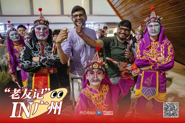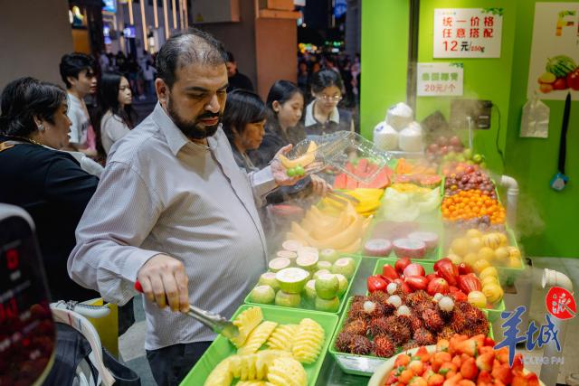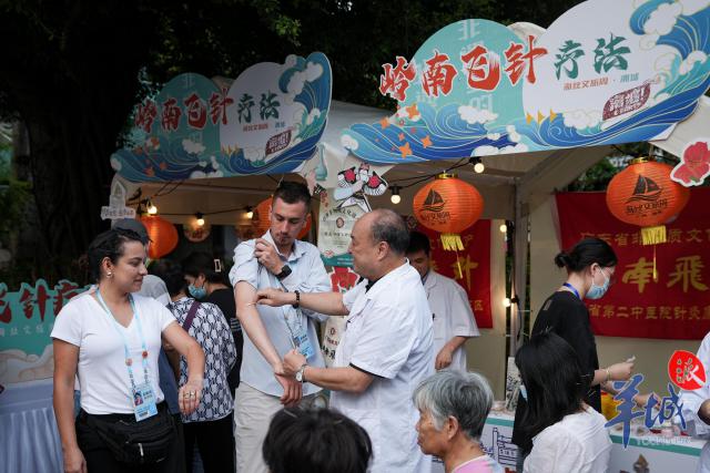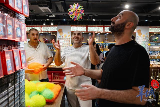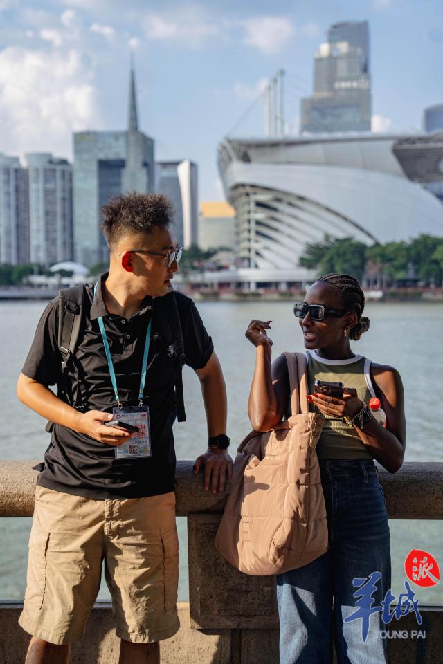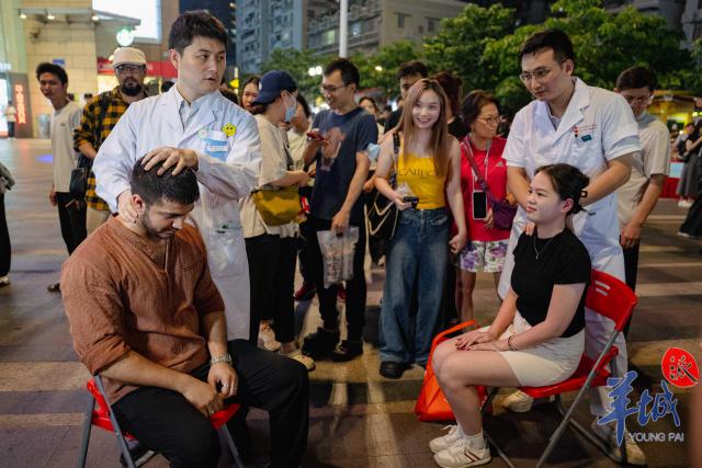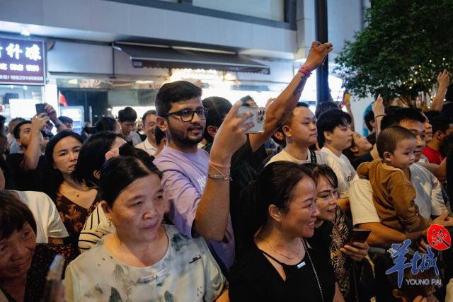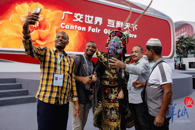 在越秀区北京路步行街,一场巨大的英国歌舞吸引了外国商人。他们像市民一样熟练地接近英国歌队的成员,希望找到一个拍照和互动的好时机。一些外国商人骑着刚刚在广交会上购买的电动行李箱走过人群,不时停下来,购买具有岭南特色的纪念品,感受特色的中医理疗。