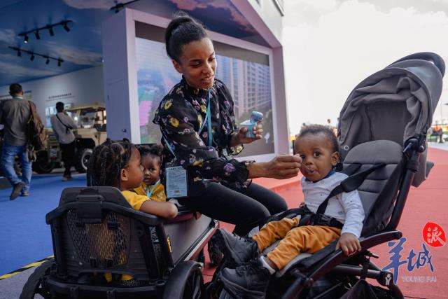 在琶洲国际会展中心,许多商人把展览作为一种旅行,带着孩子结婚去广州旅游。孩子们要么跑着,要么坐着,为展览上的新奇展品和陈设欢呼。展厅外,外国人照顾孩子,表现出放松的感觉。