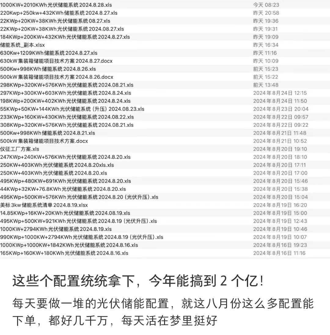 在社交网络上,张宇晒出了自己每天都需要做的一堆光伏储能配置,他放出豪言:“这些个配置统统拿下,今年能搞到2个亿。每天都活在梦里挺好。”