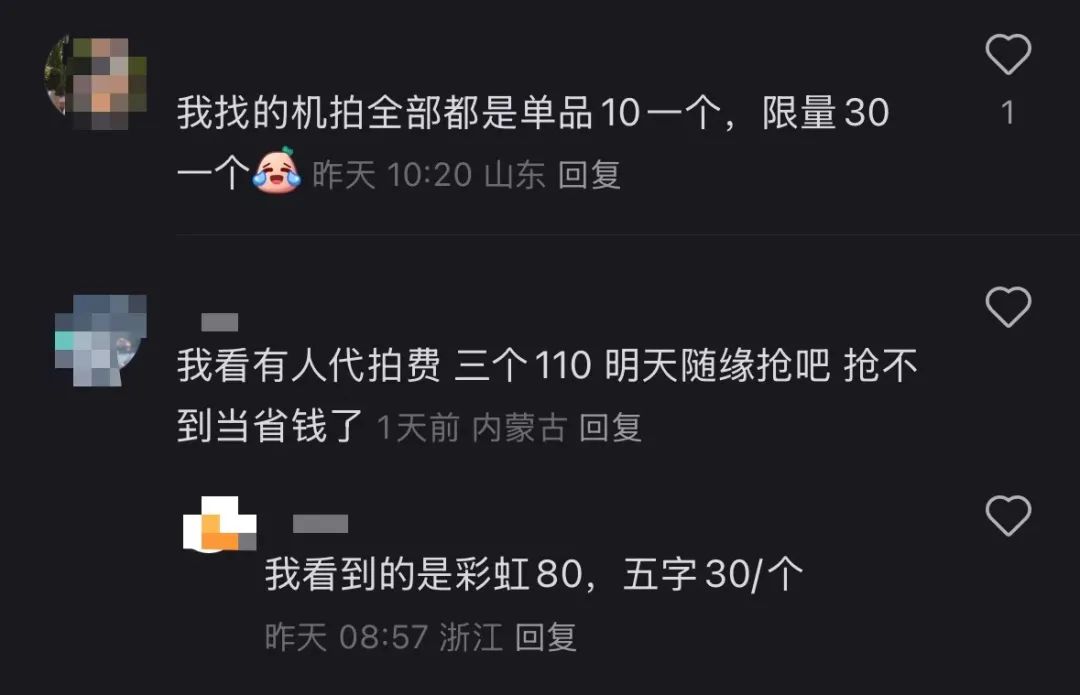 这种现象导致了两个主要的市场反应,一方面,二手平台上,涉及“捏捏代拍”的商品为数颇多,“单品10元一个,限量30一个”已经算是便宜的价位,“115元代抢3个”的情况也并不罕见。