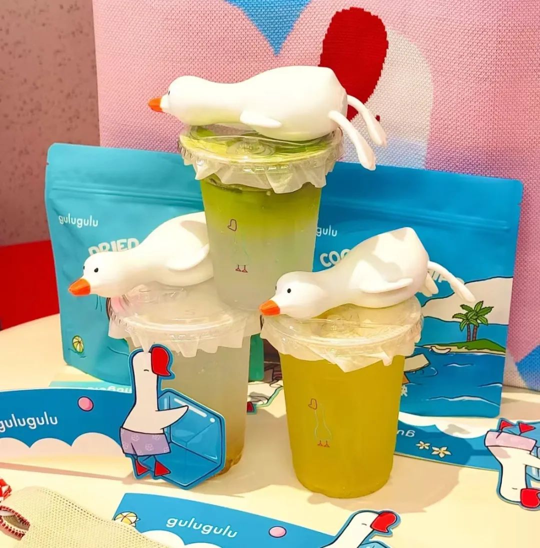 另一种常见策略是在新品发布时,将饮品的核心元素设计成捏捏,突出产品核心卖点。比如,琉璃净上新夏日乐桃桃新品时,推出了屁桃捏捏;gulugulu椰子水引发抢购的大鹅捏捏,造型和品牌logo一致,扩大了品牌形象和知名度。