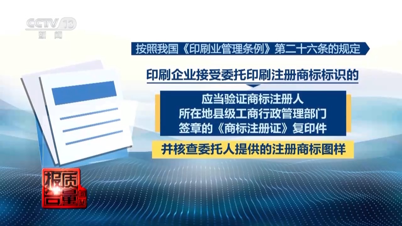 记者了解到,根据我国《印刷行业管理条例》第二十六条的规定,印刷企业接受委托印刷注册商标标识的,应当对商标注册人所在地县级工商行政管理机关签署的《商标注册证》复印件进行验证,并对委托人提供的注册商标图案进行审查;印刷企业接受注册商标被许可使用者委托印刷注册商标标识的,还应当验证注册商标使用许可合同。