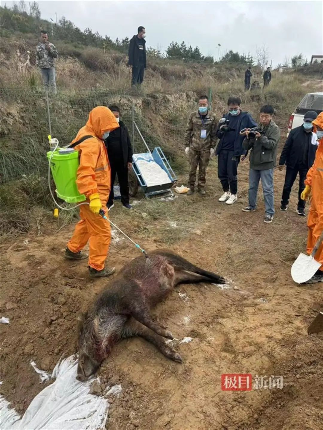 十月十七日下午,金勇护农队逮捕的第一头山猪,正在进行无害化处理(极目新闻记者邓波摄)