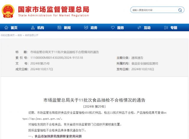 记者了解到,近日,市场监管总局组织食品安全监督抽检 650 检测批次样品 11 批样不合格。有关省级市场监管部门已组织对抽检发现的不合格食品进行审查处理。