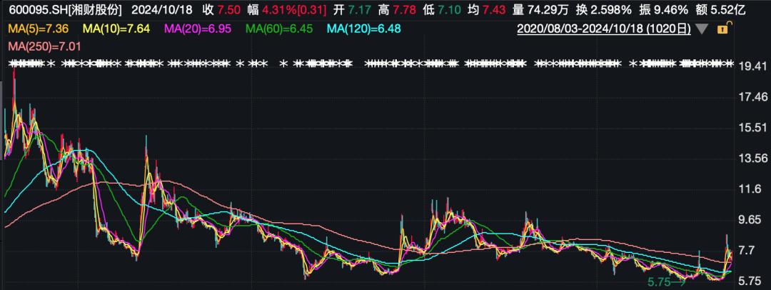 实际上,在本轮行情之前,湘财股份的股价一直比较低迷,今年7月9日一度跌至5.75元/股(前复权),创下2020年8月重组复牌以来的最低点,与当时最高价19.41元/股相比,已跌至70%。
