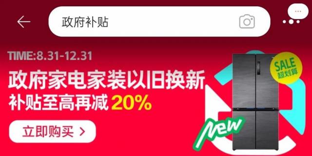 拼多多是参与国家补贴最敷衍的三大电商平台(安徽以外的小伙伴可以省钱不往下看)。目前在线补贴区域只支持安徽。如果在拼多多搜索栏输入“政府补贴”,就会出现“新旧置换家电补贴”区。