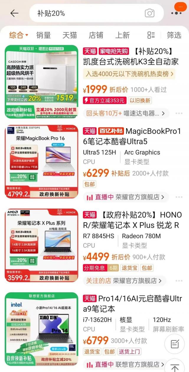 其次,直接搜索关键字“补贴” 20% ",淘宝 / 根据个人大数据,天猫将根据个人大数据 关键词,为你选择目前还有活动的家电型号。(比如牛叔之前搜过笔记本和空调,但是目前空调基本不参与活动,搜索结果里可以看到没有空调。)