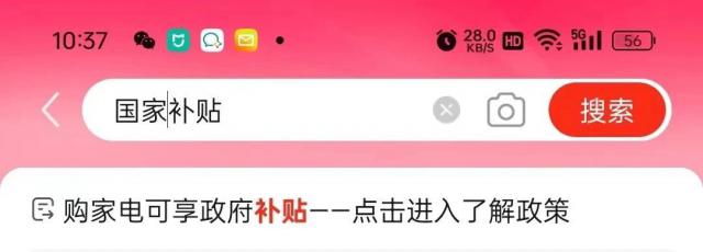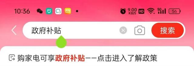 首先,在搜索框中输入“政府补贴”(天猫) APP 搜索“家电补贴” 4 个字)